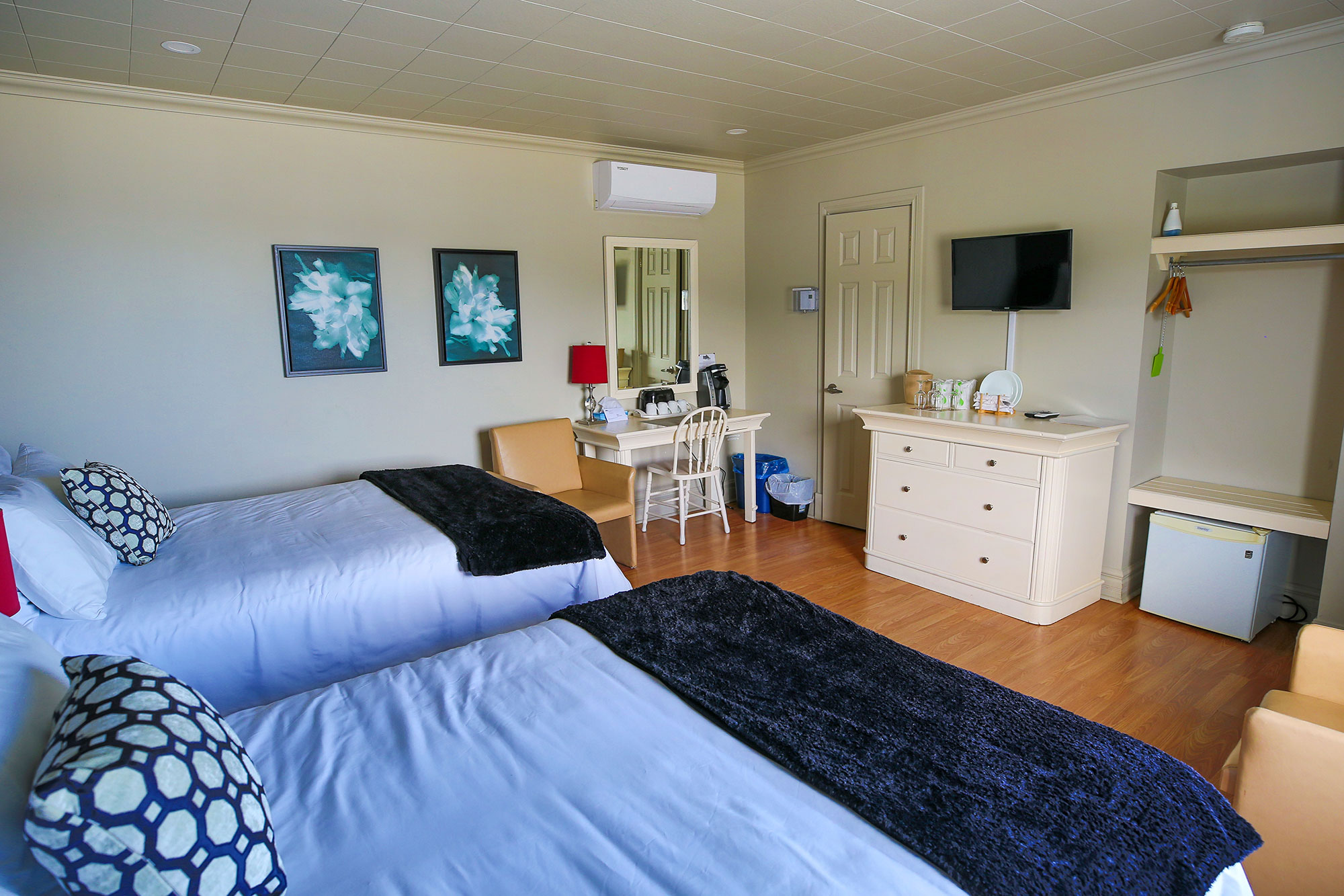 Belle chambre pouvant accueillir jusqu’à 4 personnes avec 2 lits double et vue sur la baie. Elle comprend un réfrigérateur, une cafetière et une télévision. La salle de bain complète offre les produits de bain essentiels ainsi qu’un sèche-cheveu.